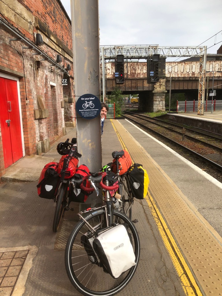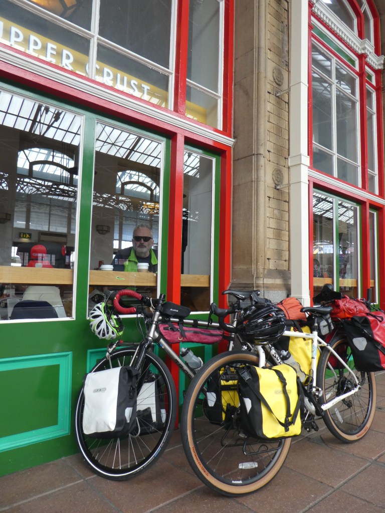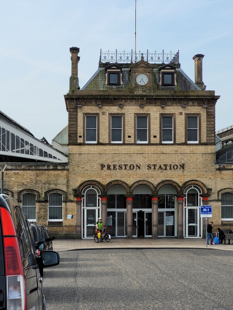 We set off at 0715 in soo much time for our 1001hr train at Preston. Previously during our Prep Phase we had preloaded the route which Garmin had selected for us to travel from Grimsargh to Preston. With Garmins preprogrammed and panniers locked and loaded, we set off. Garmin had selected a nice route which I would imagine compares well to an urban Somme. Lots of broken glass and rough tracks. The twenty minute ride took some 40mins, but little did we know as we arrived at Preston that the evil Garmin had more in store for us later.