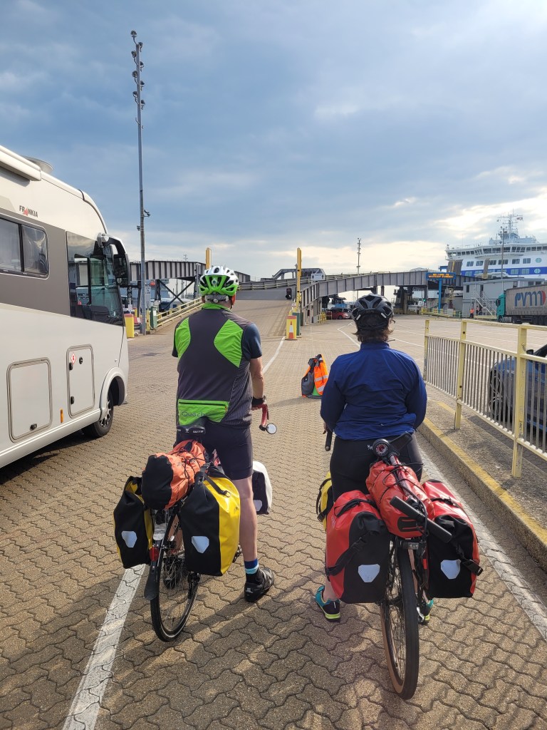 Train to Pompey was slow. Setting down at Pompey we trusted our Gremlins and they actually worked fine this time. We queued with many motor cyclists and met our first cycle tourer Dave (normal) – he is cycling from Spain back up through France. Nice bloke.