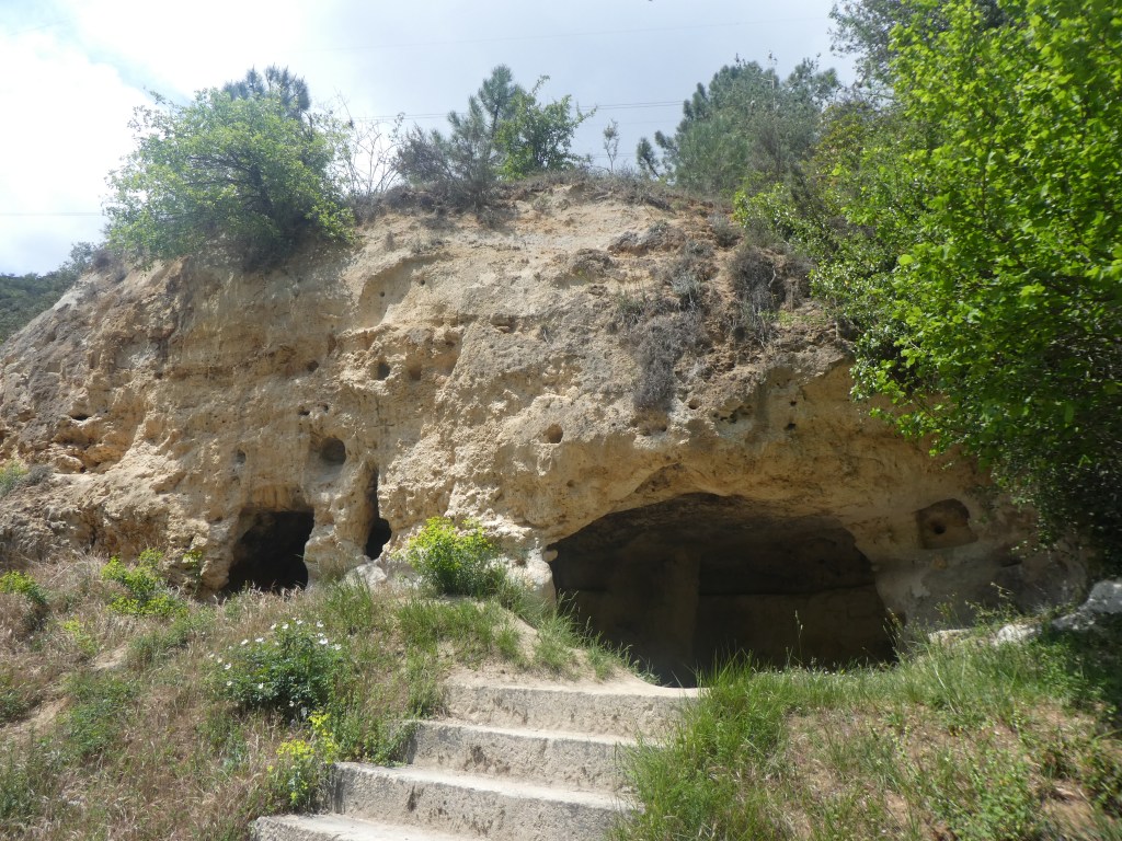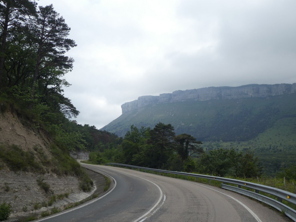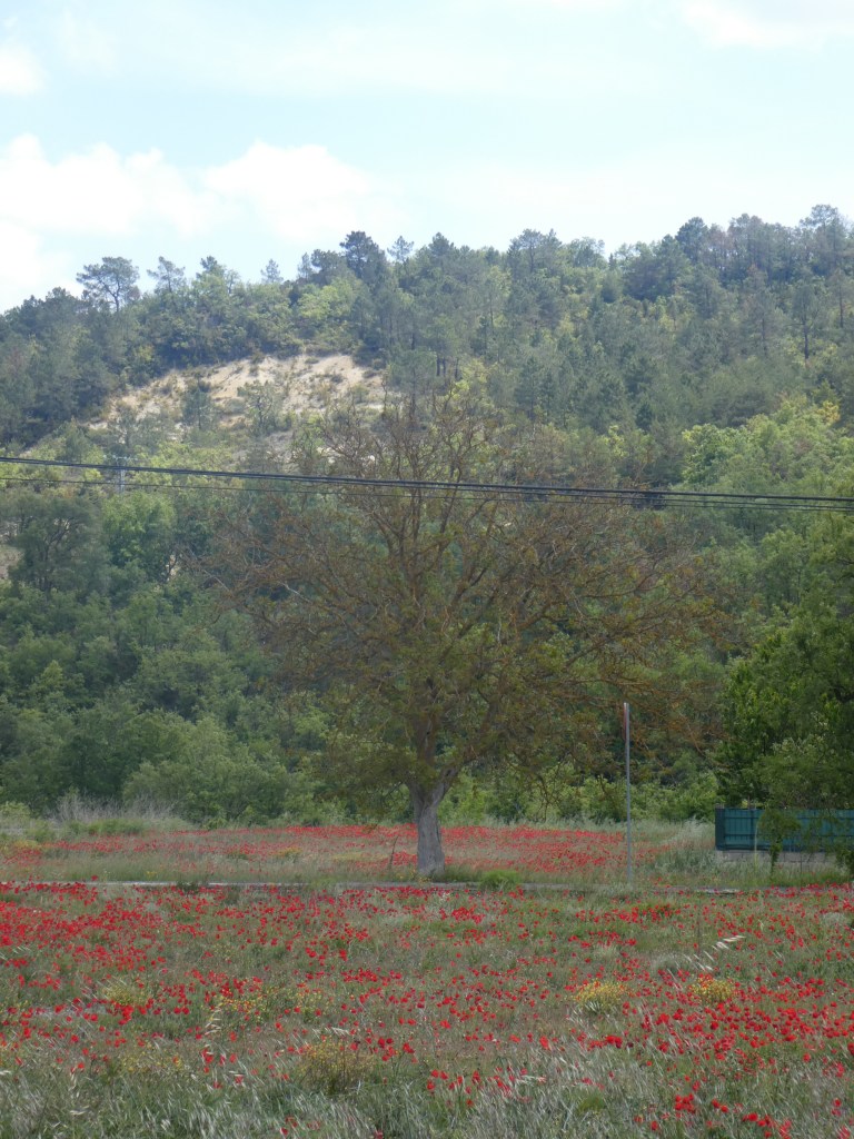 Some general pics of today’s surroundings – smooth roads up the valley, surrounded by trees; a remote church atop an interesting hill; the ‘tabletop’ hill we had in our sights for several hours as we climbed up the valley; lots of poppies dotted the fields as we moved from gorges and hills and into agricultural lands; we rode through 4 tunnels today – this one was 580m long, the others were each less than 100m; looking down the valley we have climbed up from Guenes, our rest stop last night.