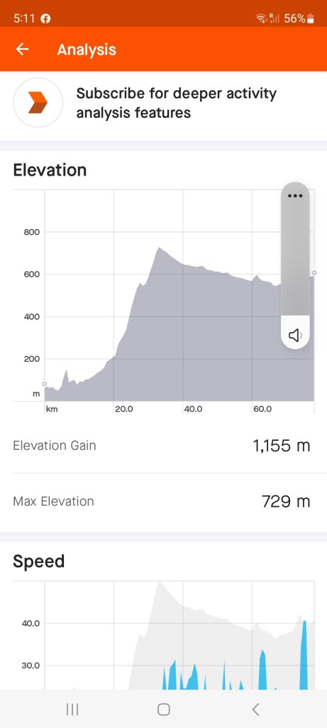 The summit was finally reached following a fair bit of graft. We did about 1150m elevation gain today that shows we had a bit of up and down along the way. A total of 78km today.