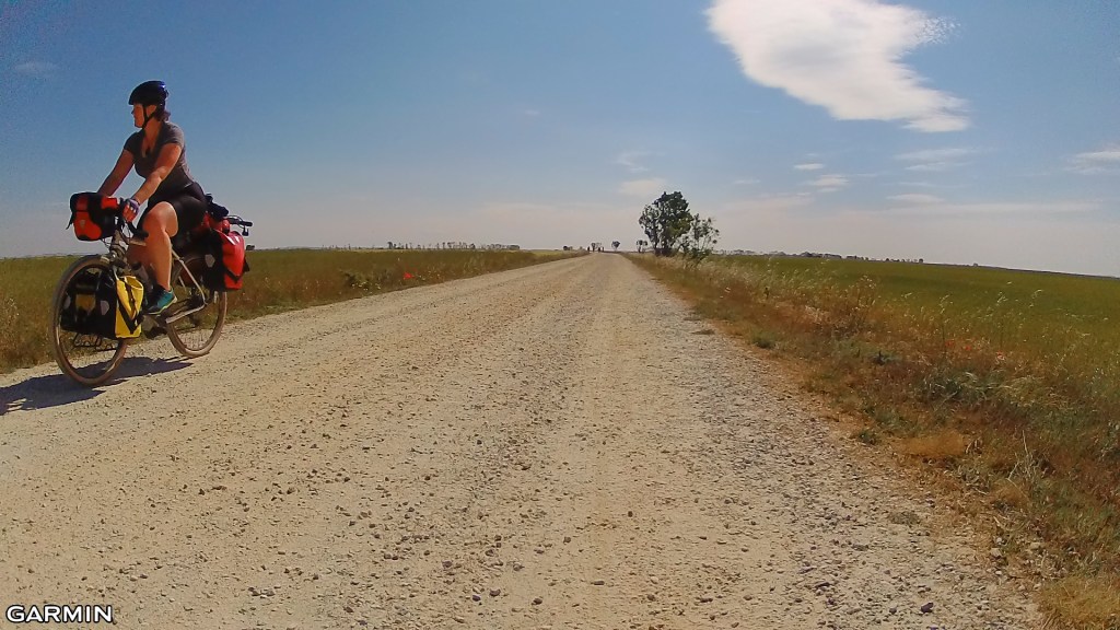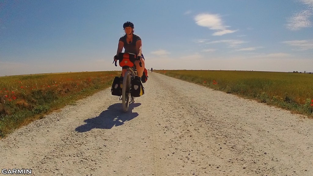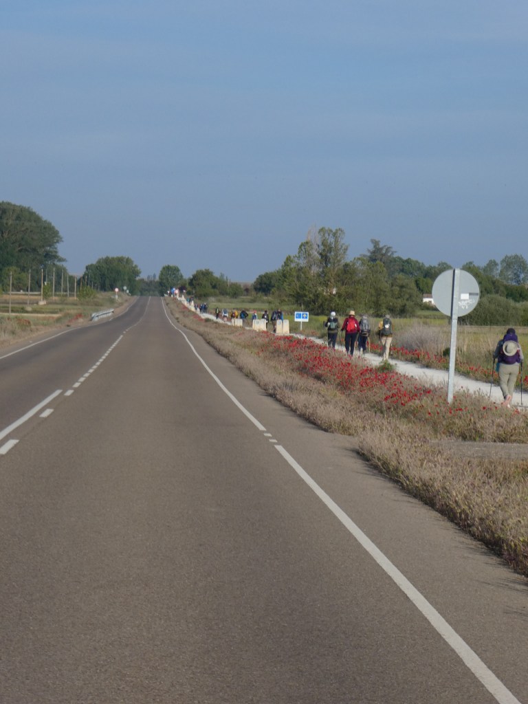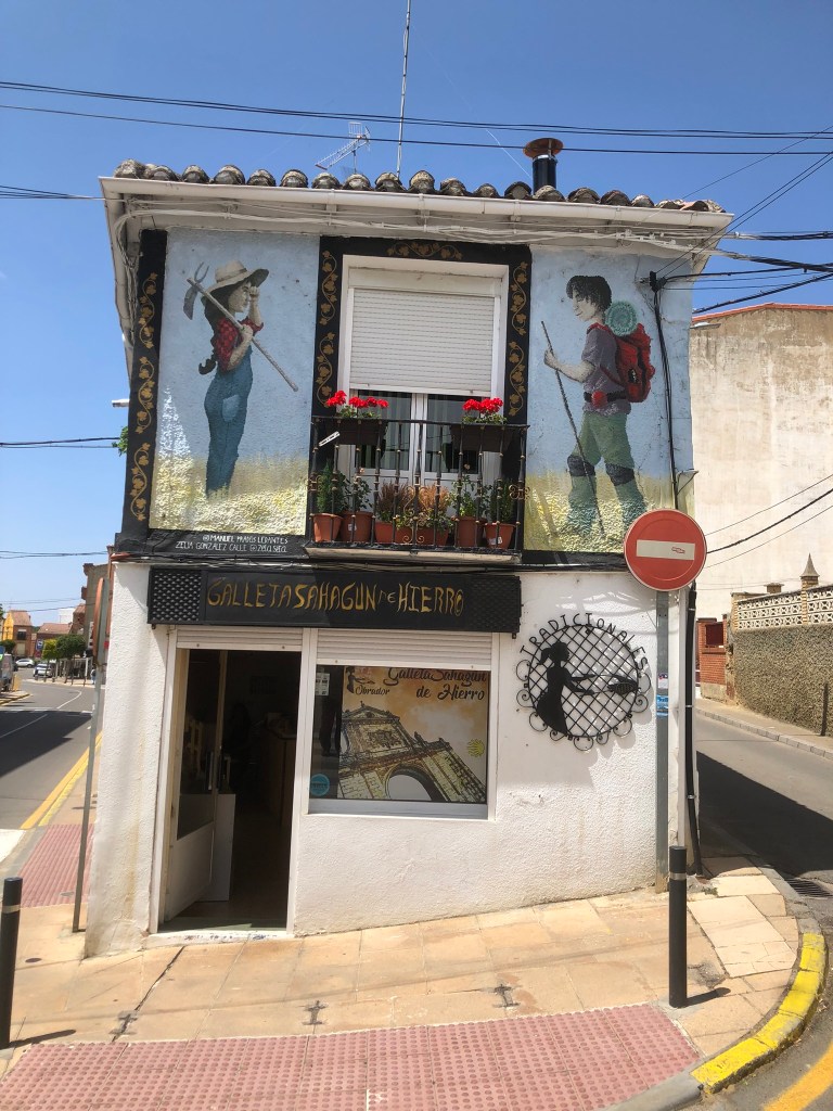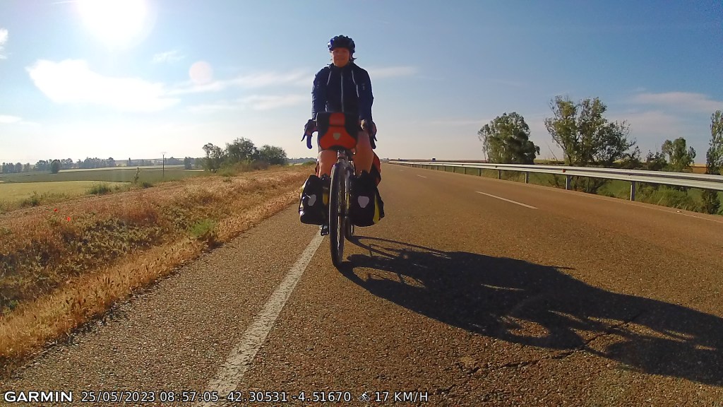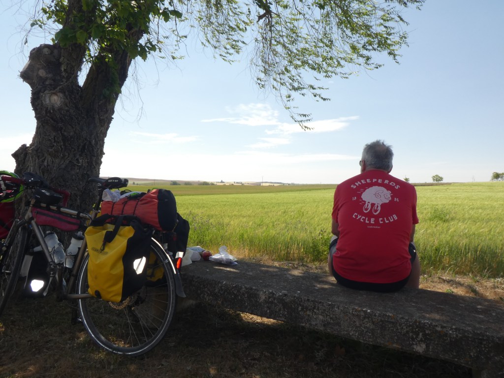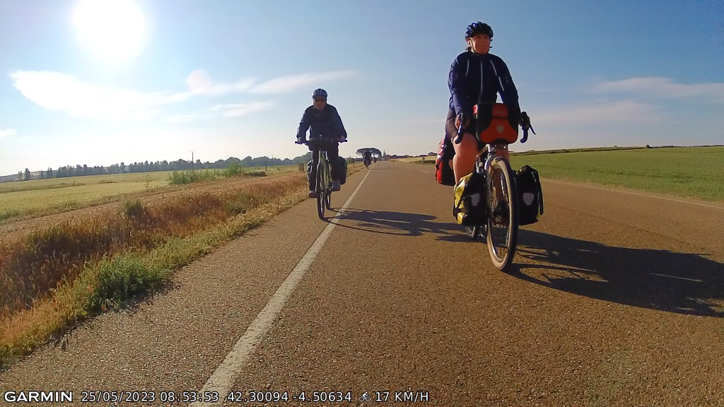 This section of the Camino is often described as dull and boring to walk – it’s a largely flat and shadeless route with long straight stretches that must seem never-ending for walking pilgrims. But by bike it was lovely flying along with our tailwind friend. I also had fun overtaking a gaggle of e-bikes, a rather unfriendly bunch – not responding to an “Hola!”