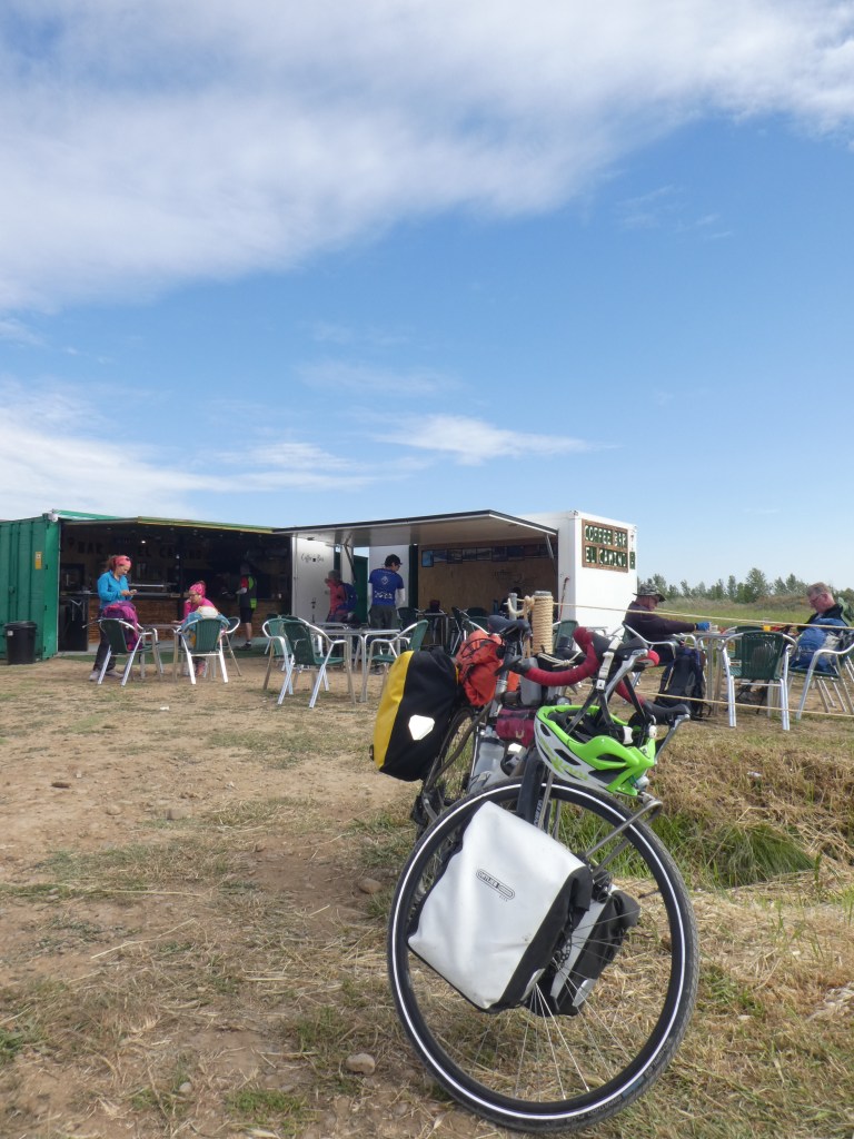 Around 1/2 way we found a small container-cafe in the middle of a field. We had our coffee stop there. Met somebody from Norwich. That’s me at the bar preparing to enter Spanish mode.