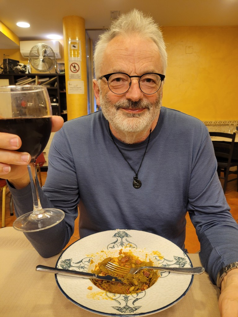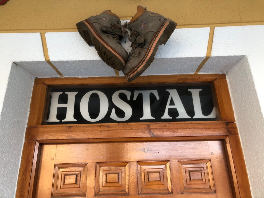 From last night – me and my greens. A menu del dia (menu of the day) is common along the camino; a reaonably priced 3 course meal with bread and wine. I was a bit stuck on what to go for on the first course menu and went for greens, well the best ever greens as they were accompanied with lots of bacon bits! I’m also looking happy as I’ve sampled a couple of local beers and the majority of the red wine that came with dinner. The menu said wine or water, I expected a glass each and we (I) got a bottle of Malbec.