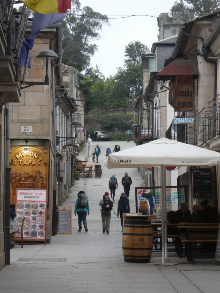 It was immediately noticeable today that the volume of pilgrims had markedly increased. This is due to Sarria being at the minimum distance for a walking pilgrim to qualify for credential of completion, 100km-ish. A big difference was the coalescence of large pilgrim groups. Most groups stuck to one side of the track, or the edge of road. But one large group of Italian pilgrims (identified by large amounts of arm waving and distorted facial gestures), about 20 in number, occupied the whole road. This was unfortunate as I was in full descent mode, bearing down at warp factor 8 and was not eager to use my brakes. So a nice loud “Hola” gave my due warning and I passed, without reducing the the Italian population.