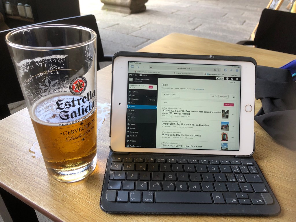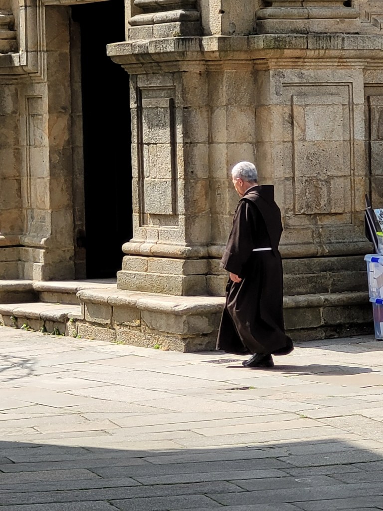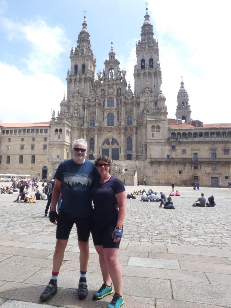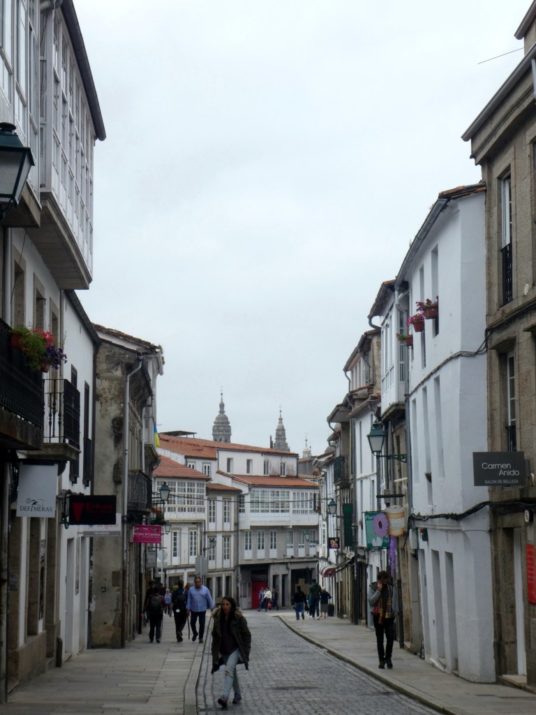 Weaving our way through narrow streets of Santiago de Compostela, we caught a glimpse of the cathedral up ahead. We also started to see the walking pilgrims again, after our EV3 route took us away from the walking track today.